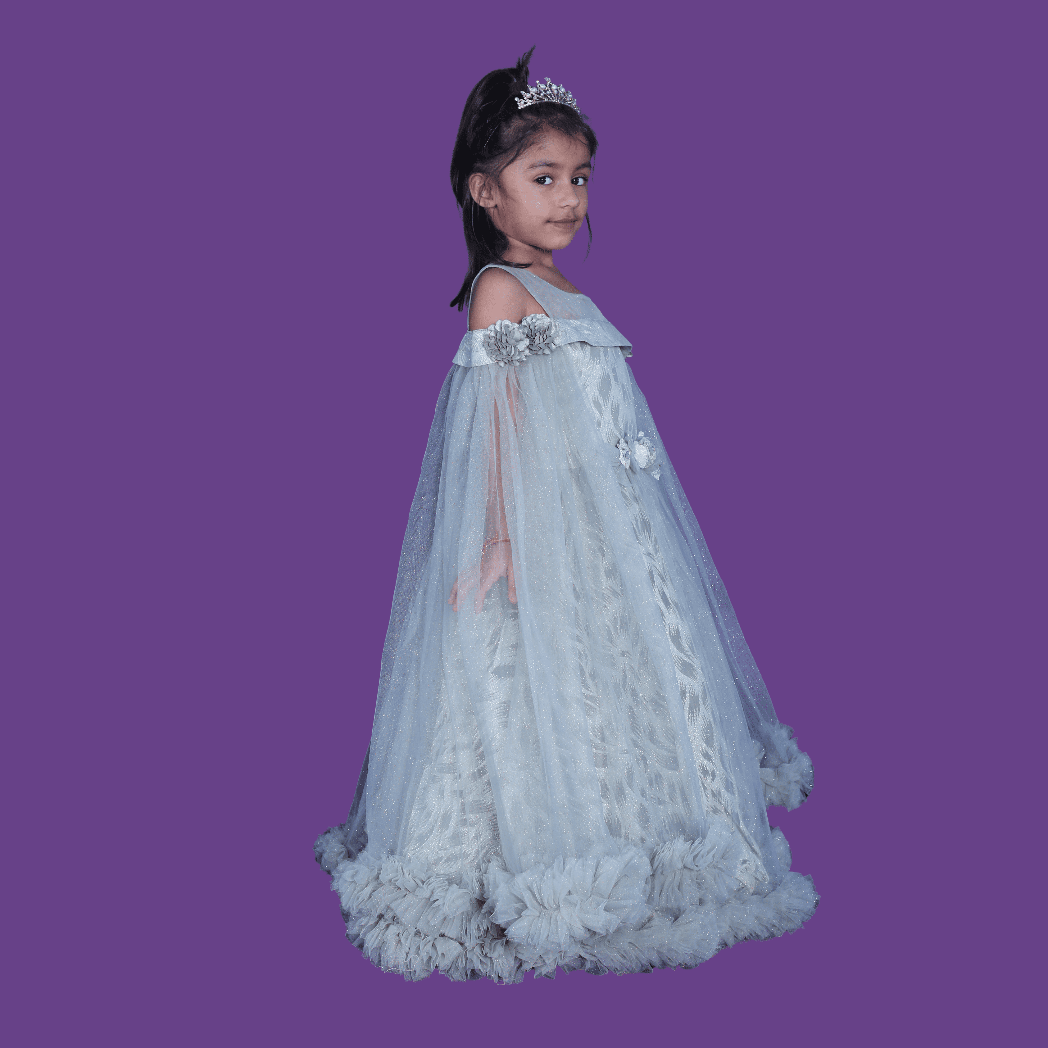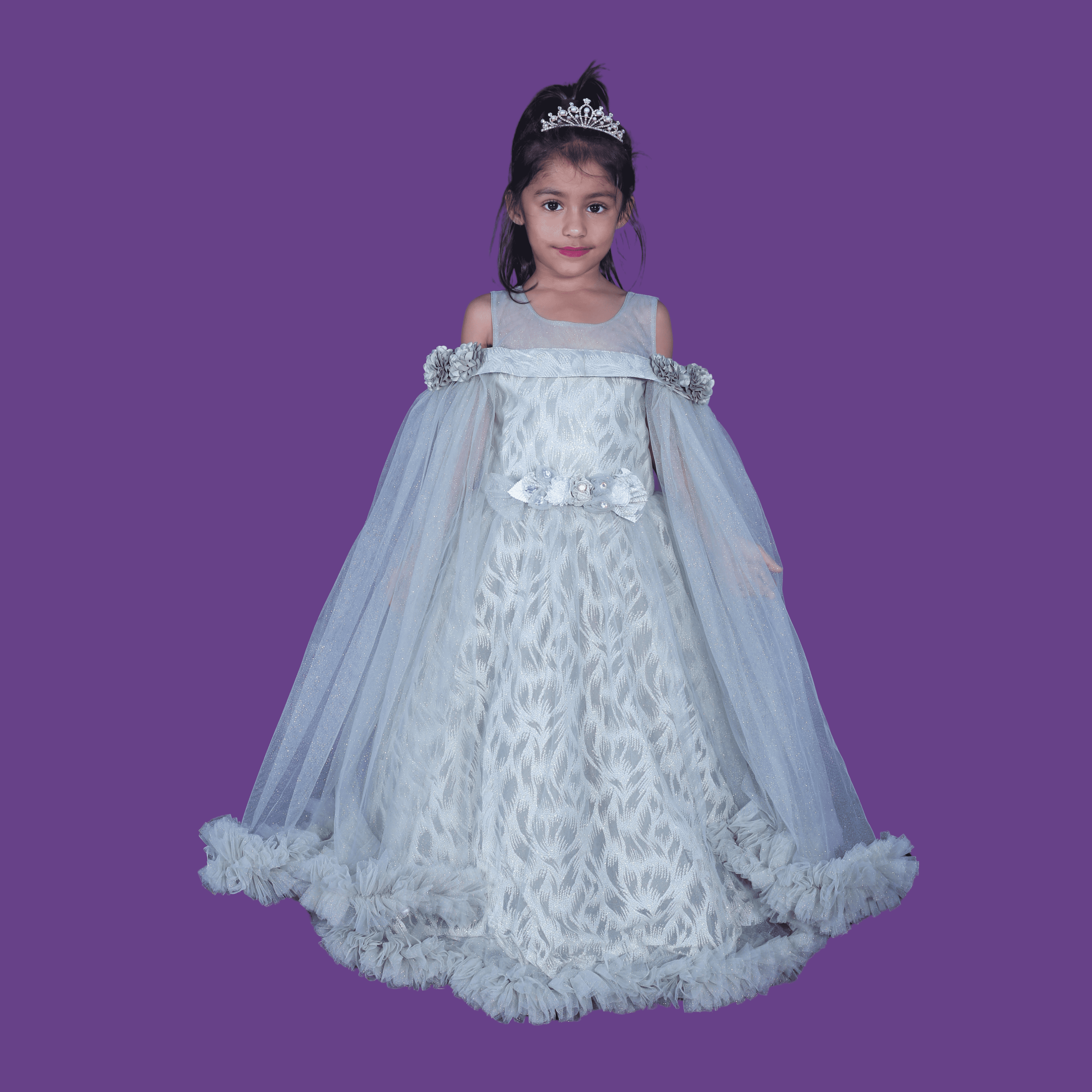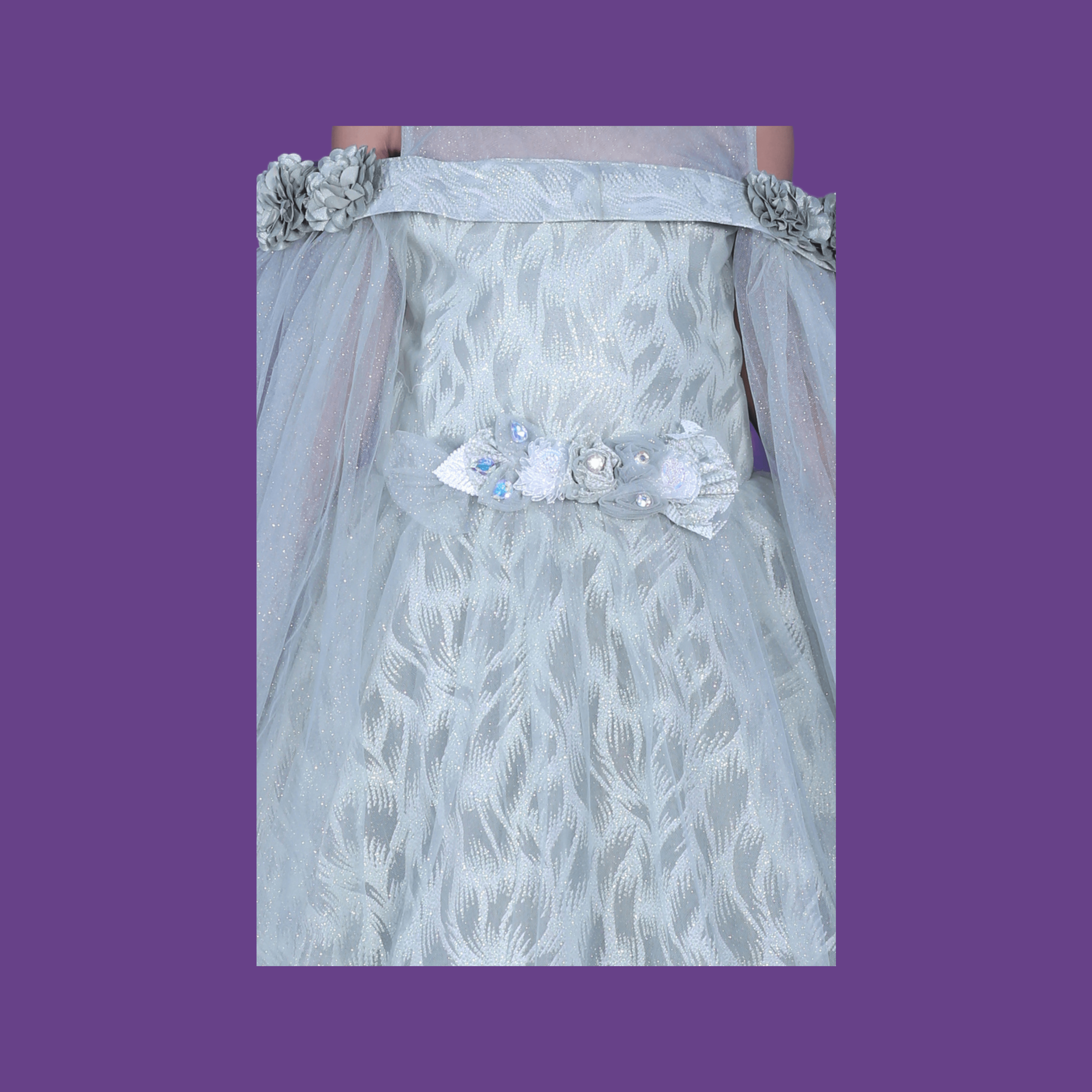 Step into a world of elegance with this breathtaking mehndi green princess gown, crafted from premium net fabric. Adorned with intricate 3D floral designs and shimmering glitter accents, this gown captures the essence of timeless beauty. The statement extra-large frill sleeves add a touch of grandeur, making it the perfect choice for your little one’s special moments. Designed to make her feel like royalty, this enchanting dress is a stunning blend of sophistication and charm, ideal for birthdays, weddings, or festive celebrations.
